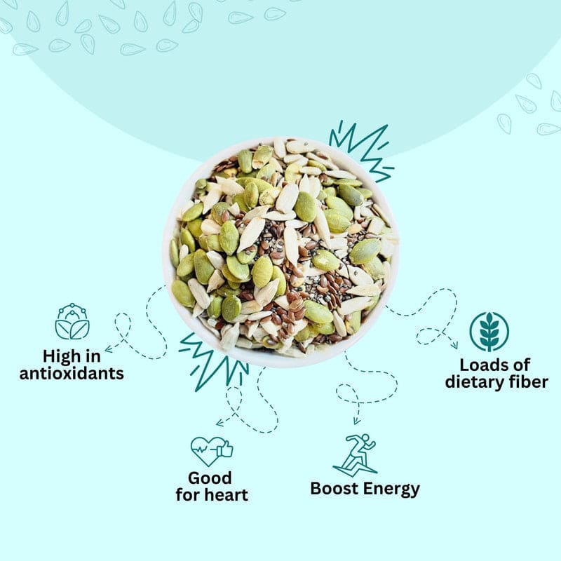 HEALTH GAIN FACTOR : This seed mix is high in antioxidants and loads of dietary fiber means that you will stay full for longer. Seeds are high in omega-3 fatty acids and are essential in providing nutrition to both, the body and the brain.