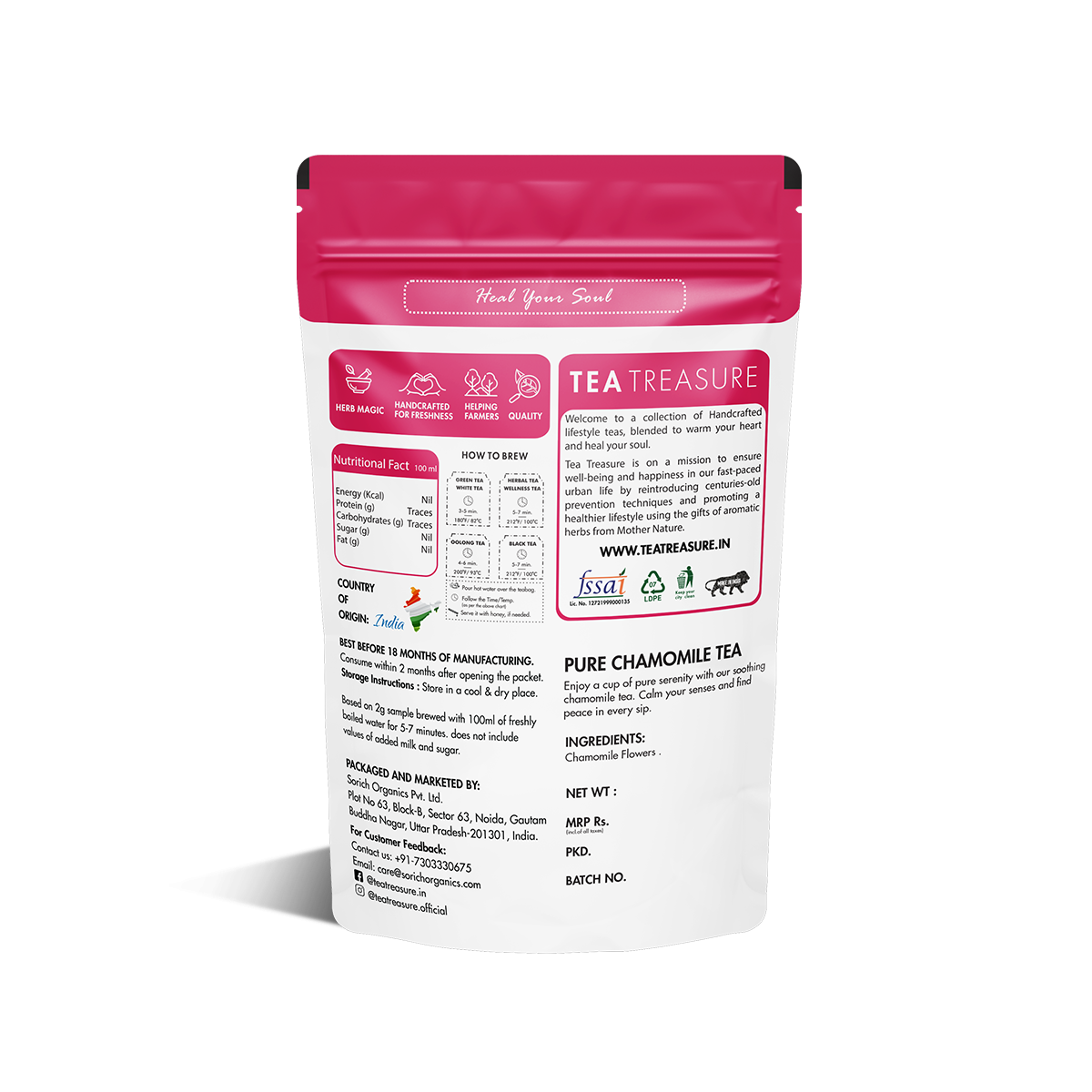 Pure Chamomile Tea ,with a few sips, provides relaxation. The flowers for the tea are selected carefully to give the tea a wonderful touch. NO flavours added.