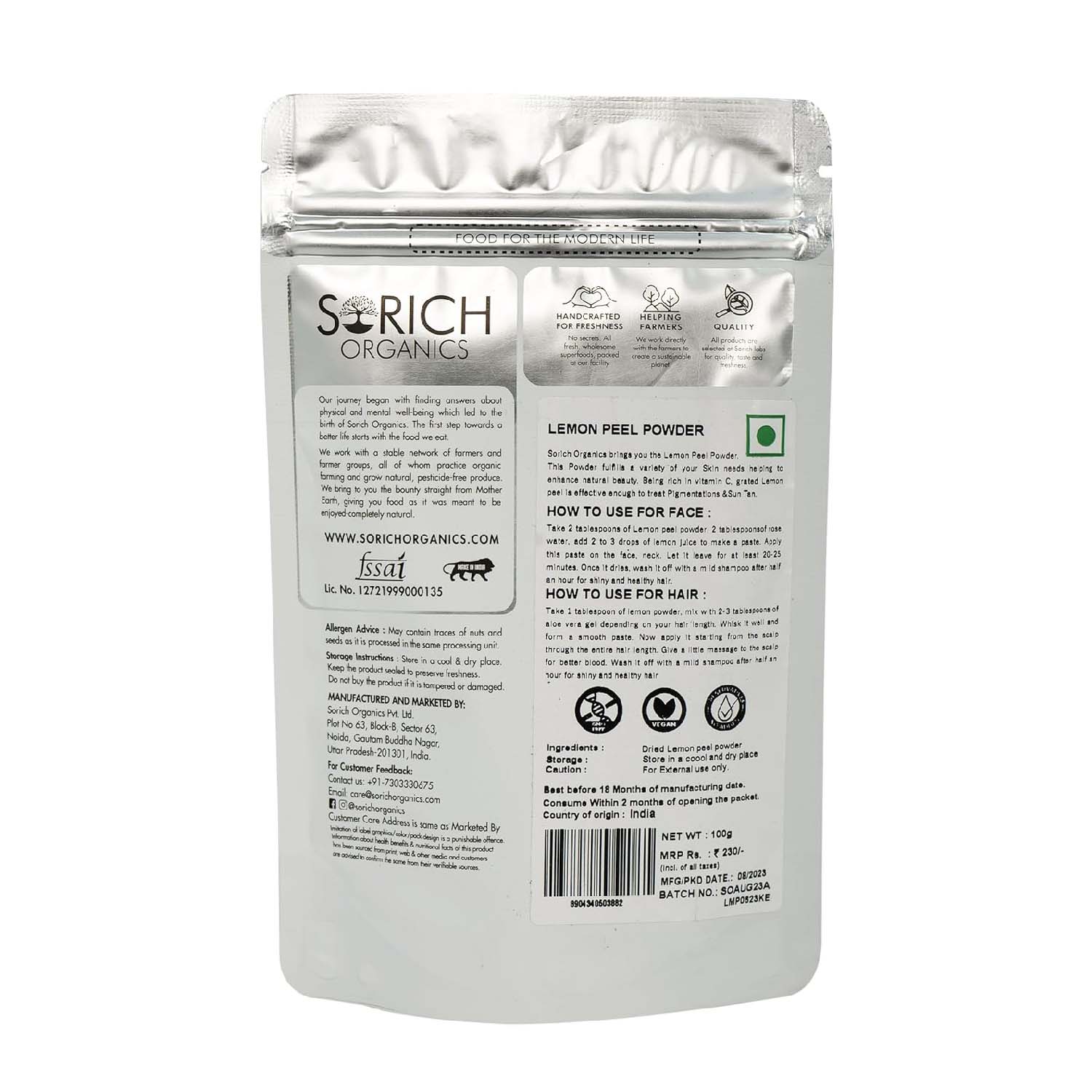 View compareFor extra love & care for your Skin, Sorich Organics brings you the Lemon Peel Powder. This Powder fulfills a variety of your Skin Needs Helping to enhance Natural Beauty. Being rich in vitamin C, Grated Lemon Peel Is Effective Enough To Treat Pigmentations And Sun Tan. Lemon peels and lemon powder help prevent and fight skin problems such as wrinkles, acne, pigmentation, and dark spots. The free radicals play a very important role in this process. Besides, antioxidants found in the peels tend to be a great detoxifier of the skin. Working as a natural exfoliating agent that helps to remove excess dirt, oil, and other impurities and gives soft, supple glowing skin.