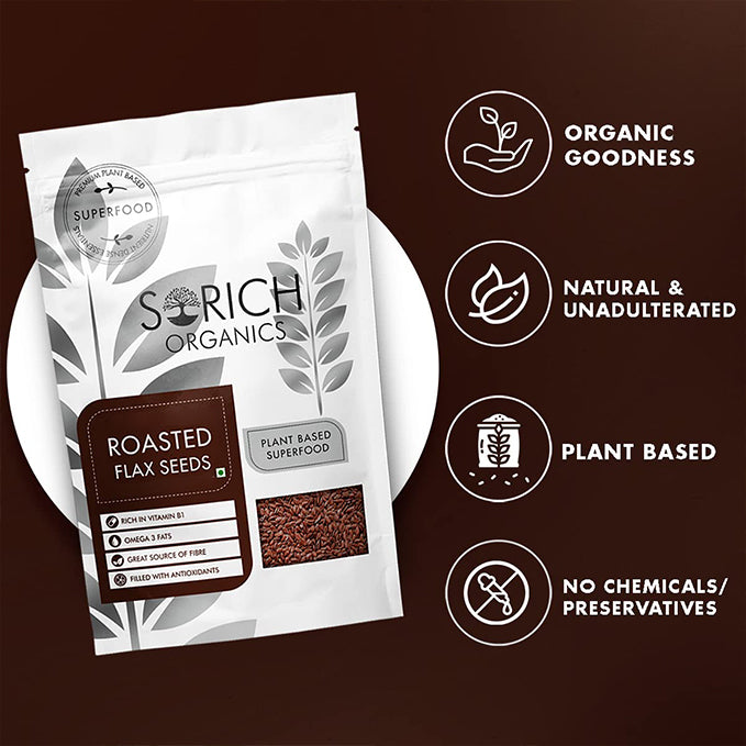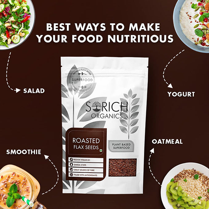 Roasted Flaxseeds are enriched with some of the most essential and basic nutrients that our body requires. These come enriched with fibre, protein, magnesium, calcium, phosphorous, lignan among other nutrients and minerals. Lignans present in them help in battling high levels of estrogen and help in maintaining balanced hormonal levels. Since flaxseeds are energy-dense with great satiety value, these make you feel full and therefore facilitate weight management. Roasted Flaxseeds are a great source of soluble mucilaginous (gumlike) fibre that can lower unhealthy cholesterol (LDL) and and balance blood sugar levels. It also acts like hunger suppressant and helps you feel full for long. Their high omega-3 fatty acids content can help lower undesirable fats (triglycerides) in the blood, reducing the risk of stroke.