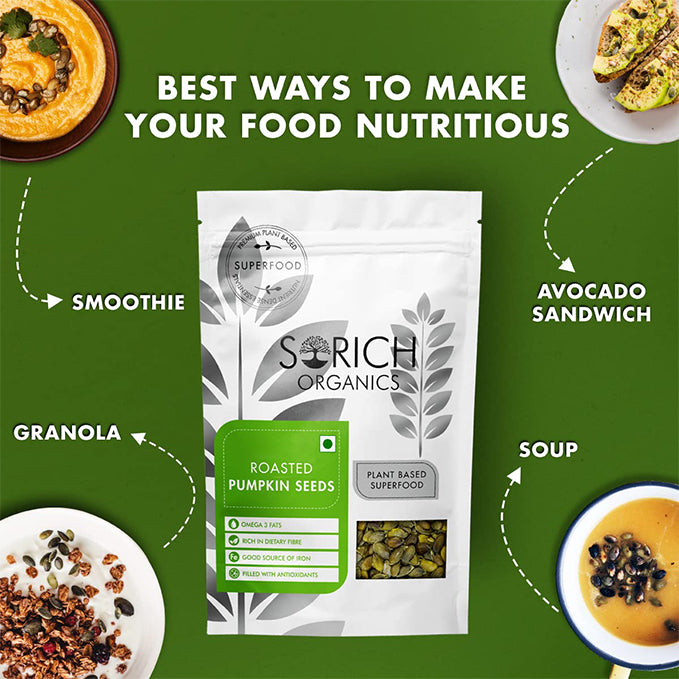 View compare Roasted Pumpkin seeds are rich in antioxidants, iron, zinc, magnesium and many other nutrients. 2. High in Antioxidants - Pumpkin seeds are full of antioxidants that may help protect against disease and reduce inflammation. 4. Improve Prostate and Bladder Health - Pumpkin seeds may reduce symptoms of benign prostate enlargement and an overactive bladder. 5. Very High in Magnesium - Pumpkin seeds are rich in magnesium. Healthy magnesium levels are important for your blood pressure, and blood sugar levels, as well as heart and bone health. 6. May Improve Heart Health - Nutrients in pumpkin seeds may help keep your heart healthy by reducing blood pressure and increasing good cholesterol. 7. High in Fiber - Whole pumpkin seeds are a good source of fiber. Diets high in fiber are associated with many health benefits, including a reduced risk of heart disease, diabetes and obesity. 8. May Help Improve Sleep - Pumpkin seeds are a good source of tryptophan, zinc, and magnesium - all of which help promote good sleep. 9. Easy to Add to Your Diet - Pumpkin seeds can be easily incorporated into your diet as a snack or ingredient in meals or baking.