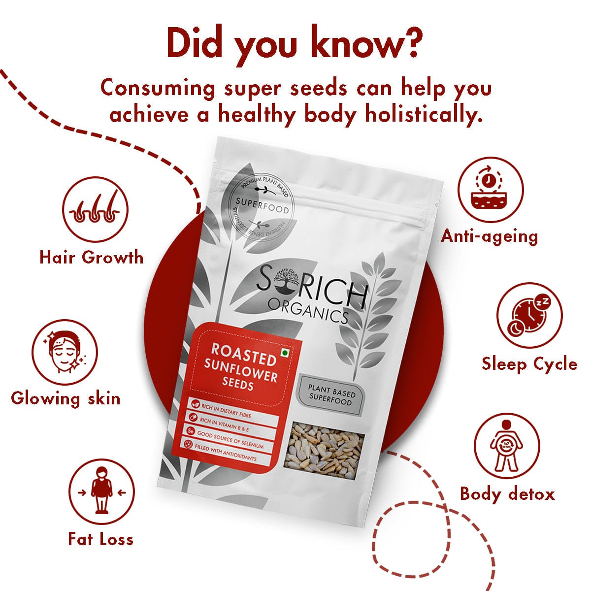 View compareSorich Organics Roasted Sunflower seeds are a source of many vitamins and minerals that can support your immune system and increase your ability to fight off viruses. These seeds are rich in & lsquo; healthy& fats, including polyunsaturated fat and monounsaturated fat. While the high levels of protein in sunflower seeds already help boost your energy levels, other nutrients like vitamin B and selenium can help keep you energized.