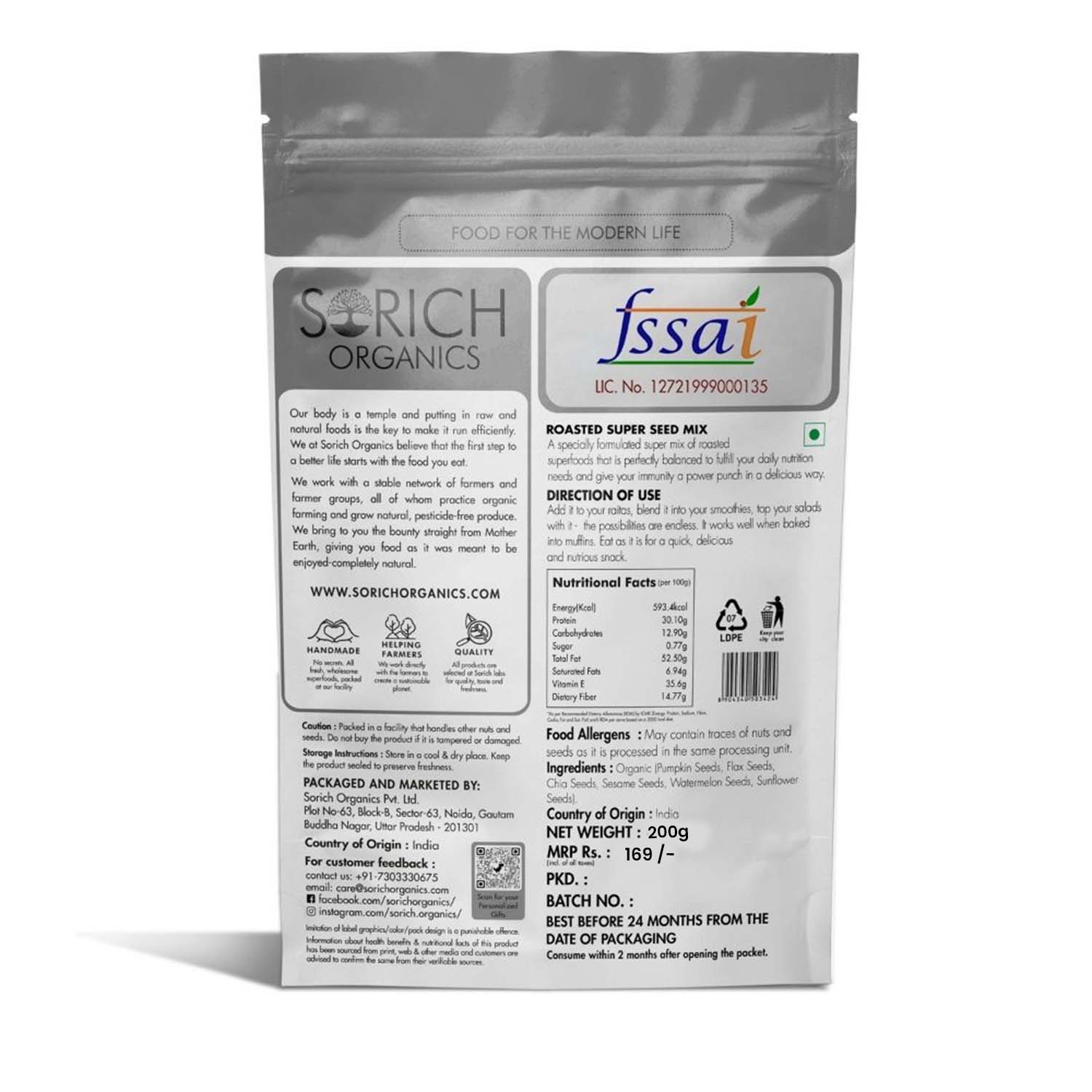 View compareA specially formulated roasted seed mix that is perfectly balanced to give you a daily dose of nutrition in a delicious way. This roasted seed mix consists of pumpkin seeds, sunflower seeds, flaxseeds, chia seeds, and sesame seeds which provide this product a boost of nutrients. The crunchy and delicious combination of seeds offers a number of benefits. It is high in antioxidants and loads of dietary fiber which means that you will stay full for longer. The roasted Seed mix is high in omega-3 fatty acids and is essential in providing nutrition to both, the body and the brain. One can add it to raitas, blend it into smoothies or top salads with it - the possibilities are countless. Sorich sources each of its seeds from tried and tested Indian farmers and assures that the product contains zero additives, preservatives and is completely natural.